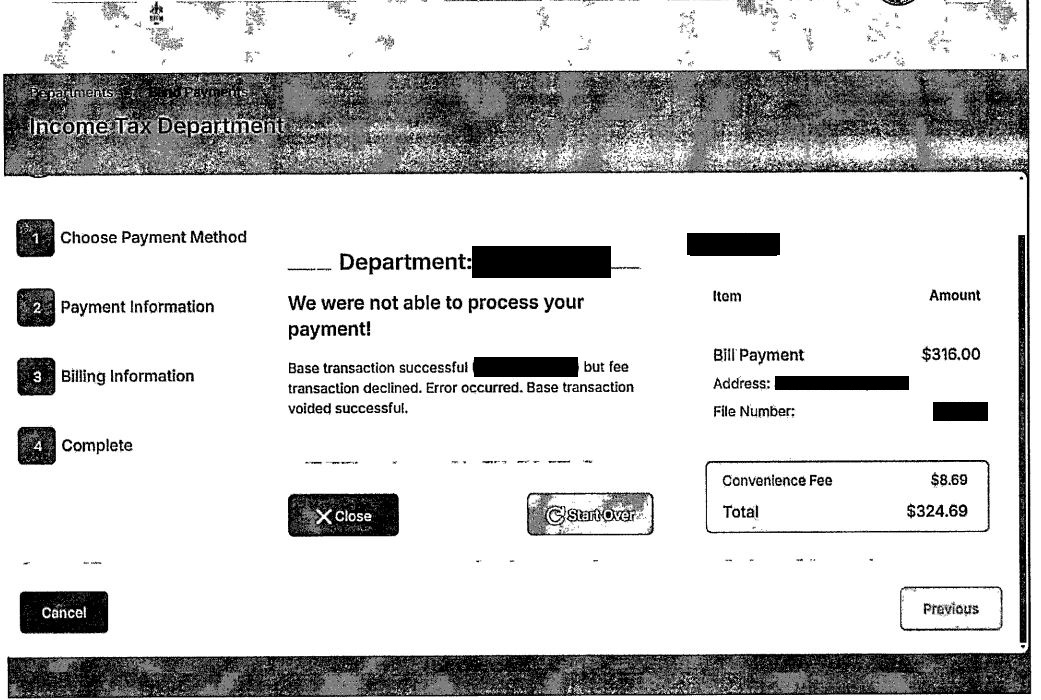 Sometimes you may receive a notice stating "Base transaction successful (Transaction ID) but fee transaction declined. Error occurred. Base transaction voided successful" as shown here.
