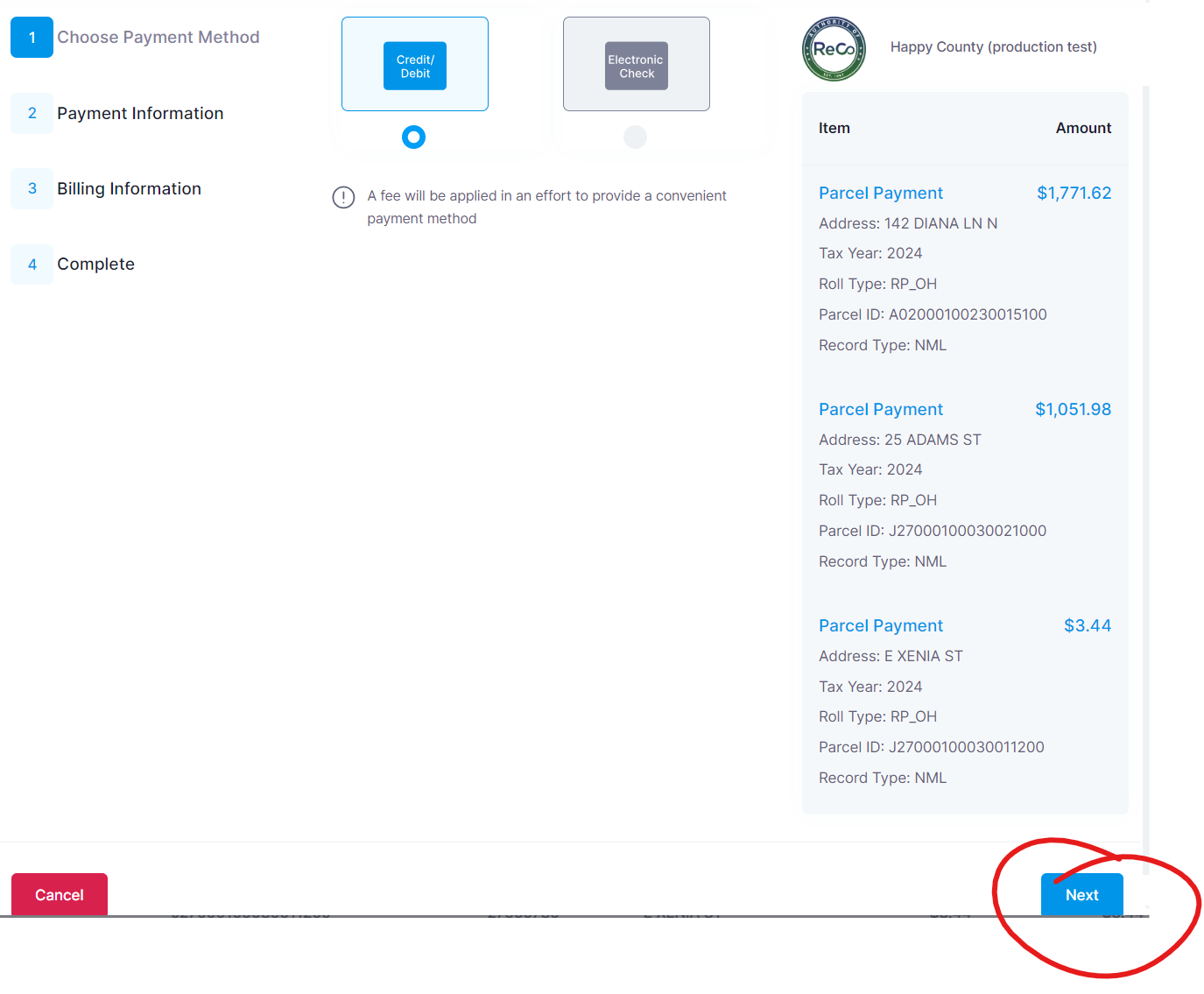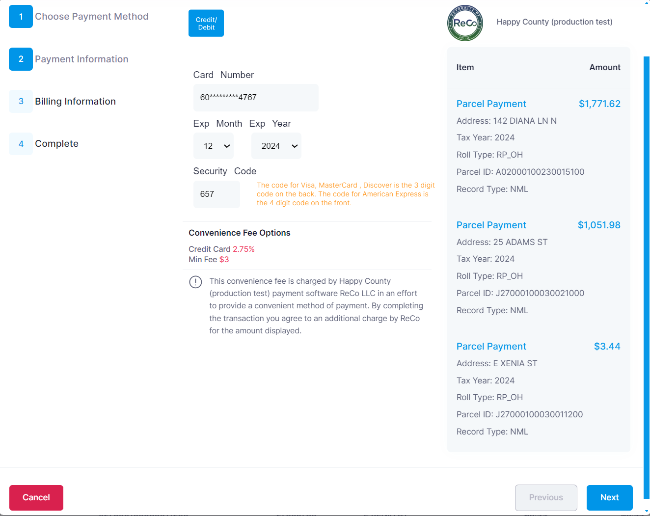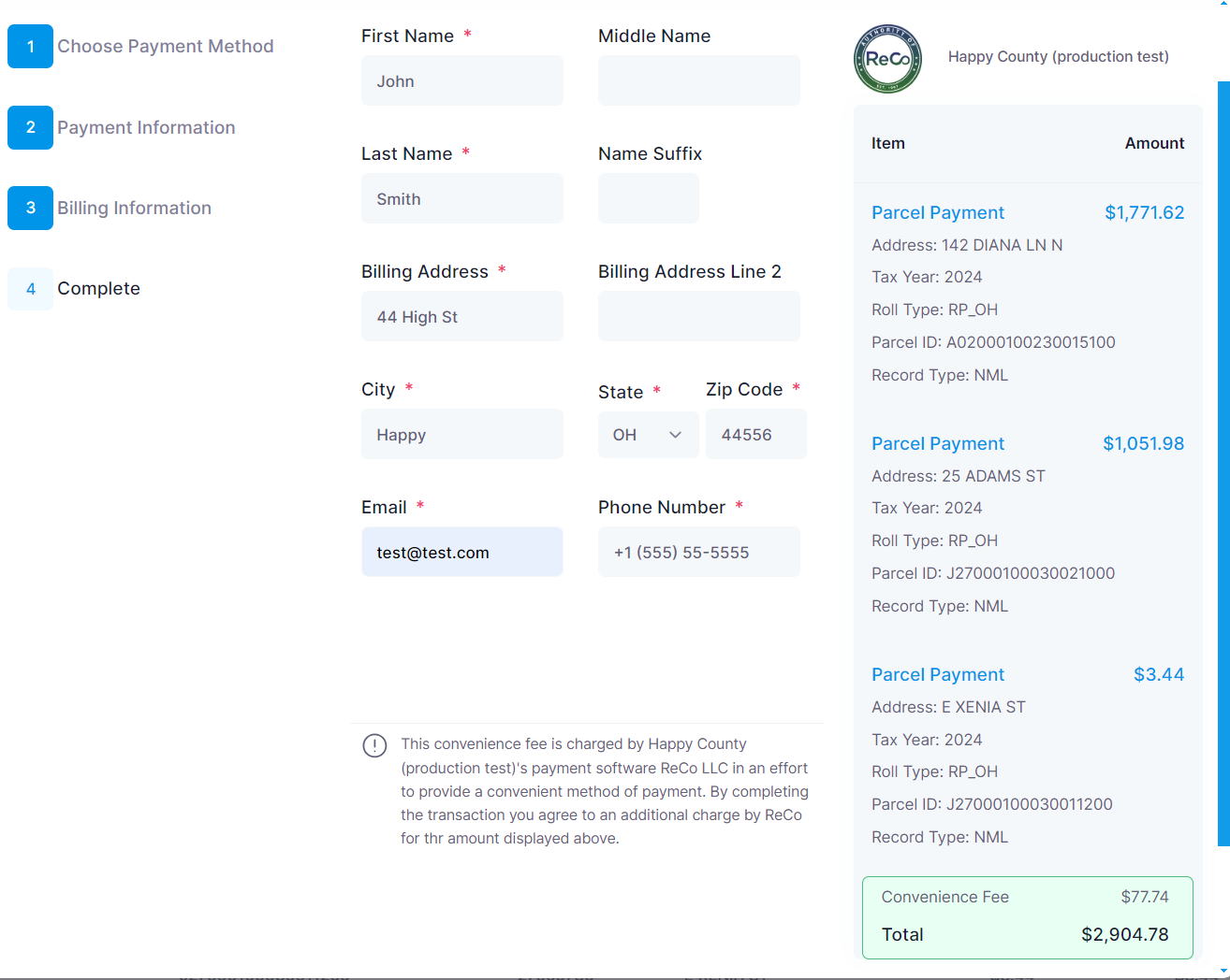 Enter billing information. The Convenience Fees are calculated on the total on this page. The email address used on this page will have payment receipt sent to it.